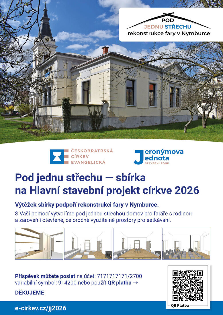 v letošním roce budeme opět přispívat ve velikonoční sbírce na Hlavní stavební projekt (dříve Hlavní dar lásky). Ústřední shromáždění Jeronýmovy jednoty-stavební fond (dále jen ÚS JJ-SF) schválilo jako Hlavní stavební projekt pro rok 2026 projekt farního sboru v Nymburce s názvem „Pod jednu střechu – rekonstrukce bytu faráře“.